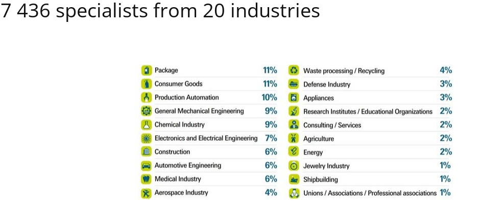 各种各样的人来到我们这里:来自包装、消费品、生产自动化、汽车、化学工业、电子和电气工程、建筑以及航空航天工业、应用和医疗工业等行业的参观者